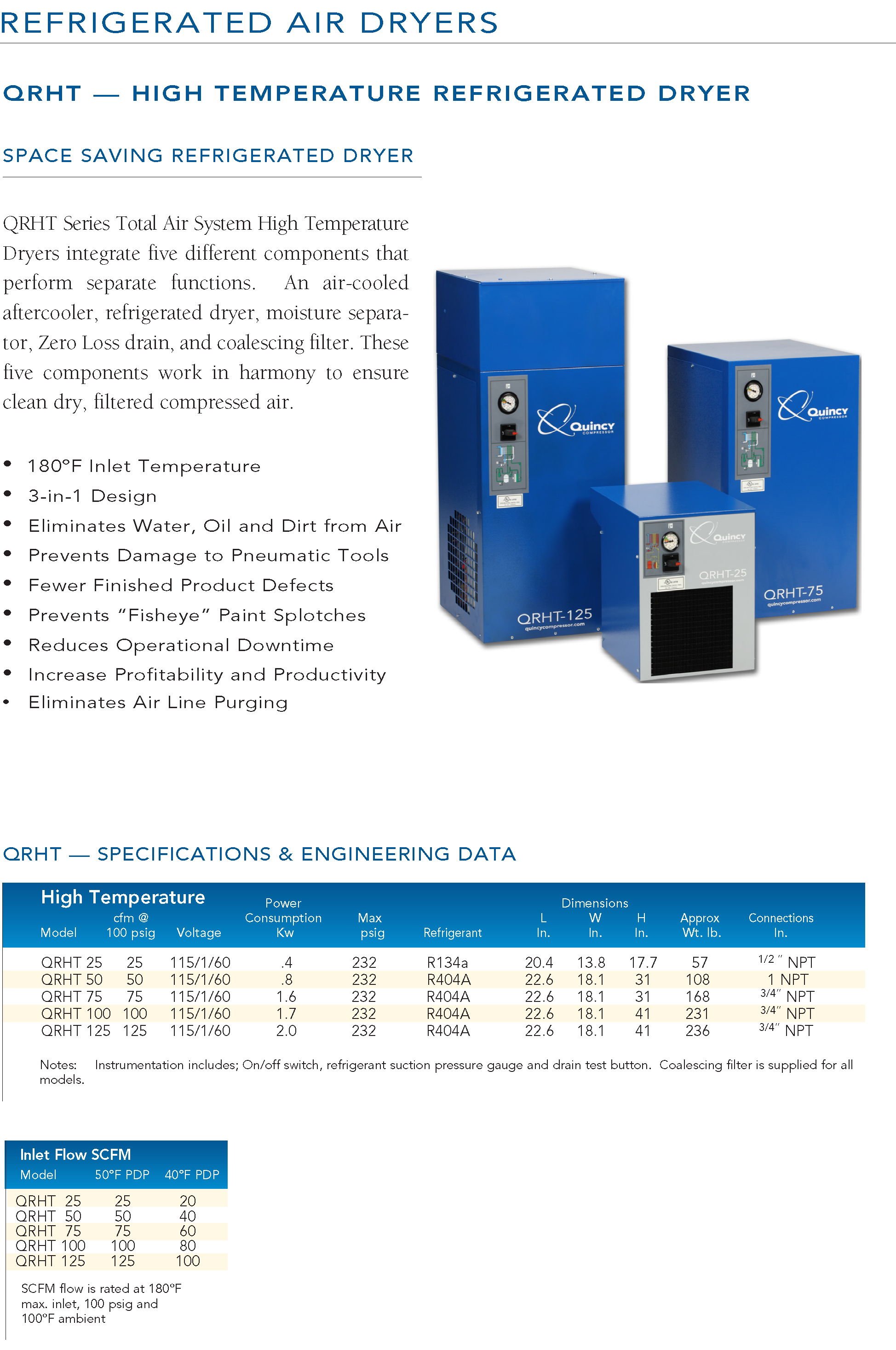 QRHT Series Total Air System High Temperature Dryers integrate five different components that perform separate functions. An air-cooled aftercooler, refrigerated dryer, moisture separator, Zero Loss drain, and coalescing filter. These five components work in harmony to ensure clean dry, filtered compressed air.