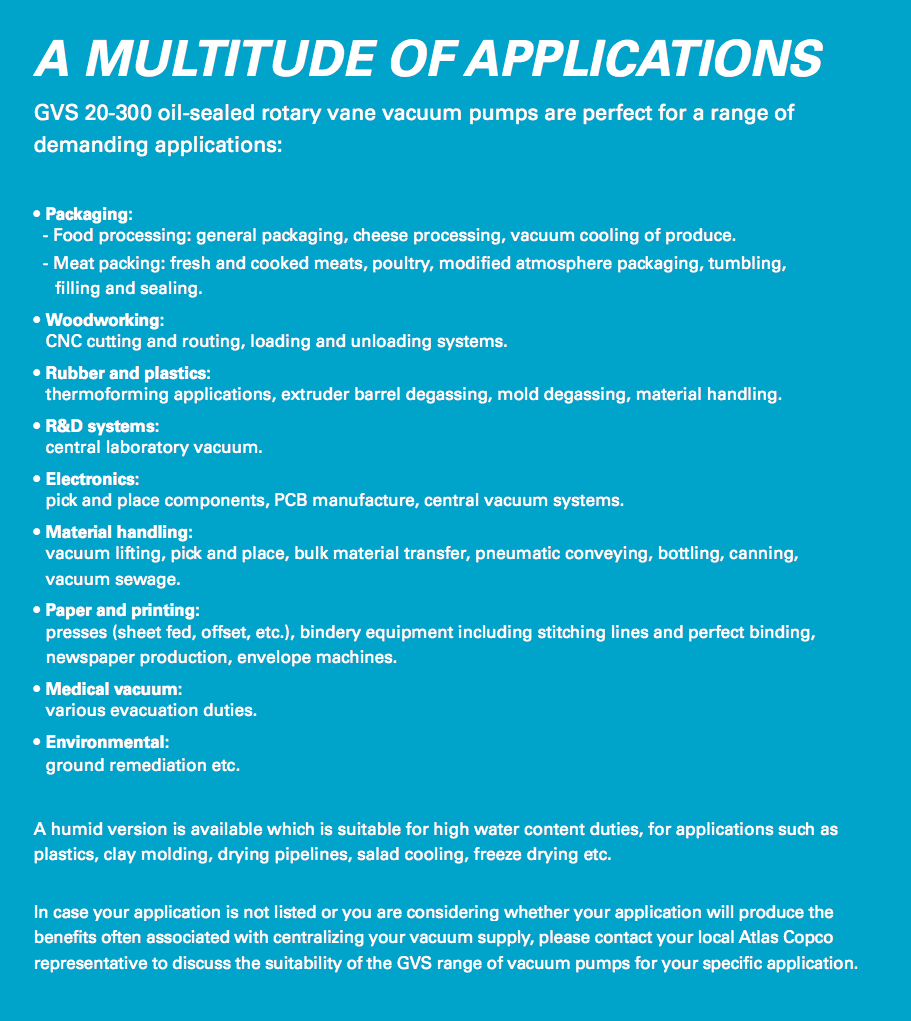 At Atlas Copco we constantly aim to innovate, improve performance and target new application areas. The GVS 16-630 A series continues this principle by applying proven oil-sealed rotary vane technology with a robust, highly regarded and technologically advanced market leading design.