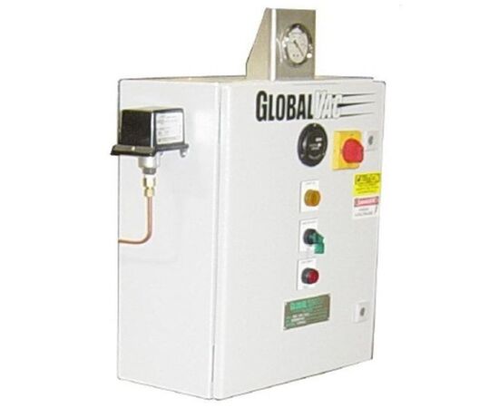 The GlobalVac & Air lubricated rotary vane vacuum pump tank mount vacuum systems are available in 1 to 10 hp and mounted on a horizontal receiver. Systems are also available on a vertical receiver for 1 to 5hp. The system is built with isolation valve, check valve and rotary vane vacuum pump mounted inlet filter assembly with quick clasp system for easy element changeout, The receiver is equipped with a sight glass and a manual drain valve. The System is operated by a mounted and wired Simplex Control Panel.