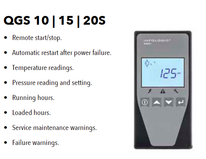 | Quincy understands the critical nature of your compressed air system to maintain production. Quincy's QGS line of compressors help drive your profitability by lowering your total cost of ownership while providing you with the performance and reliability that you have come to expect from Quincy compressors. The QGS air compressor has many of the features, benefits, and advantages of larger compressed air systems in a package that fits your application and at a price you can afford. |