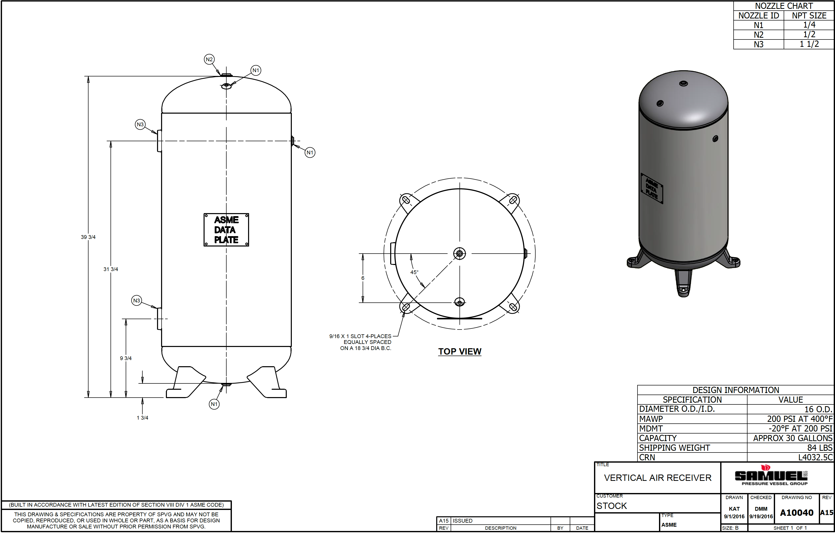 SteelFab 30 Gallon Vertical Air Tank, 16" x 38" with Feet 200 PSI, ASME Coded | A10040